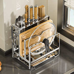 キッチンナイフホルダー収納ラック、穴あけ不要の壁掛け式多機能鍋蓋ホルダー、箸立て、鍋つかみ、スプーン一体型収納