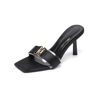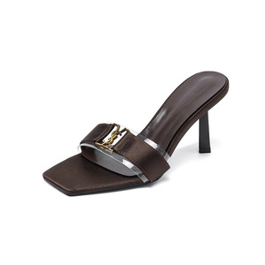 2025年新作夏用女性用スリッパ、ファッショナブルなヨーロッパとアメリカンスタイルの女性用サテン生地のスクエアトゥスティレットハイヒールサンダル