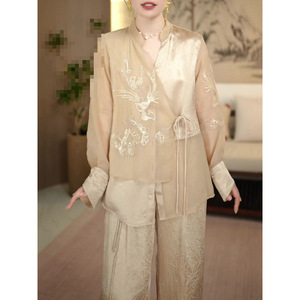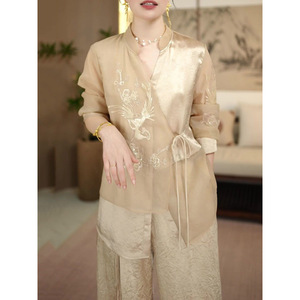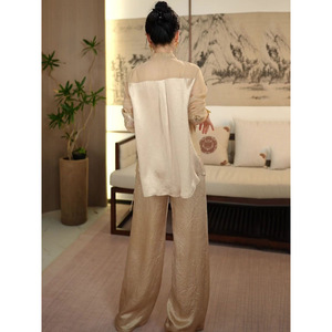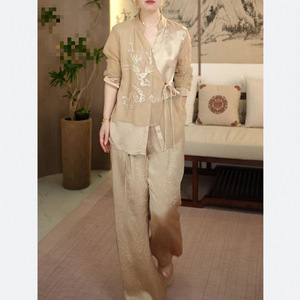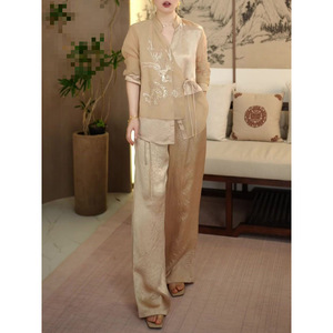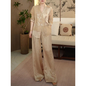 夏の新しい中国風エスニックスタイルニッチファッションスーツボタンカーディガンジャケット+ワイドレッグパンツ2点セット