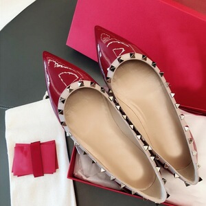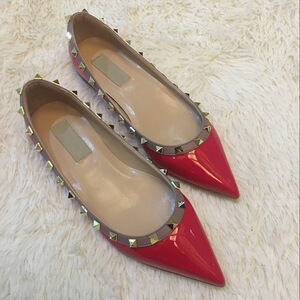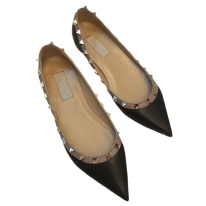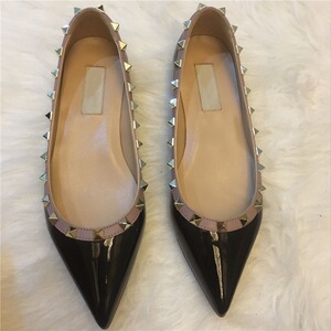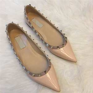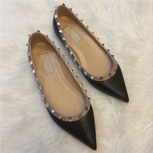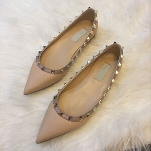 高版本 v家铆钉平底鞋柳丁真皮尖头浅口平跟船鞋祼色单鞋女平底女