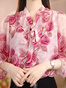 ピンクローズ長袖シャツ女性の夏の新しい蝶ネクタイシャツ女性のフレンチエレガントなボトリングシャツ大きいサイズ Tシャツ