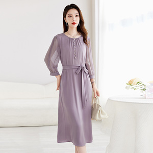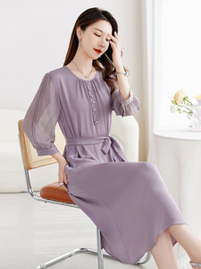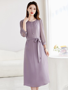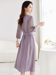 【パープルテイスト】91.8%マルベリーシルクストレッチダブルジョードレスウエスト通勤着痩せドレス9130
