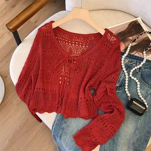 フレンチデザイン中空かぎ針編み日焼け止めニットカーディガン薄手長袖痩身年齢軽減ショートブラウストップ女性用