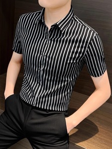 夏薄いハイエンドストライプ半袖アイスシルクシャツメンズ新しいファッショントレンディなブランド紳士服ビジネススリムシャツ