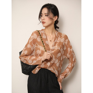 ハイエンドプリントシルクジョーゼットシャツレディース長袖2025春夏襟気質薄いマルベリーシルクトップ