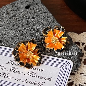 [Yacheng Jinhui] レトロシンプルな二層フラワーイヤリングブラックオレンジカラーアイリングハイエンドライトラグジュアリーイヤリング C03