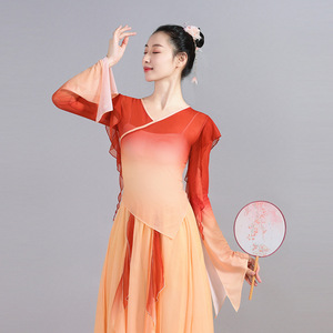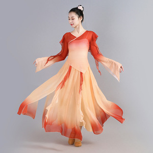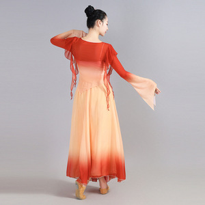 女性用クラシックダンスダンス衣装、エレガントな練習着、グラデーションスーパーフェアリーガーゼ、妖精のような中国の古代スタイルのパフォーマンス衣装スーツ