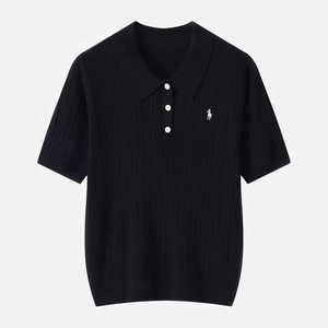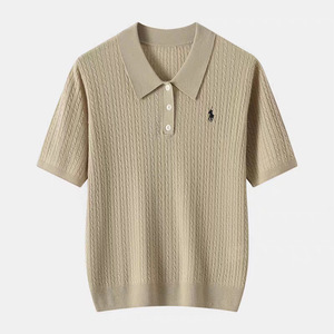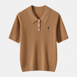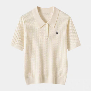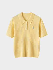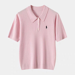 100% メリノ梳毛ウール半袖セーター女性のポロ襟ケーブルソリッドカラースリムプルオーバー Tシャツ夏と秋