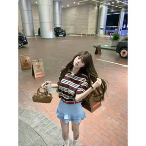 2025ストライプポロカラー半袖Tシャツ+ホットガール風プリーツフリルAライン露出防止プリーツスカート