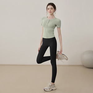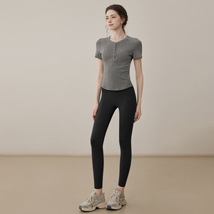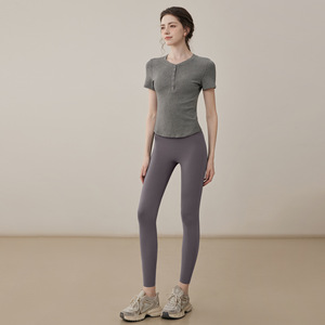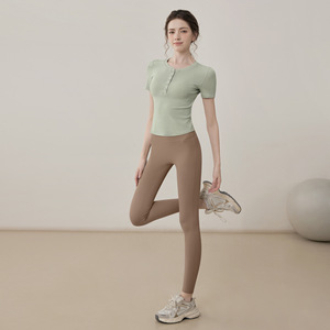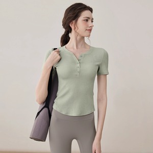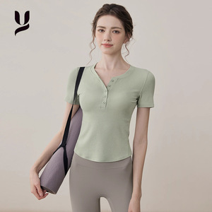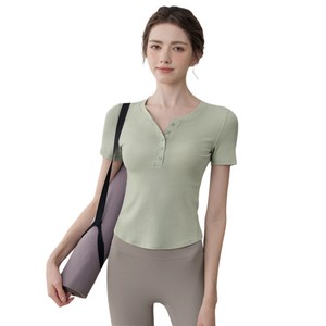 ヨガ服の夏の半袖の女性2025の新型のカーディガンはやせている運動のプラティの半袖の上着のスーツの女性の卸売りを現します。