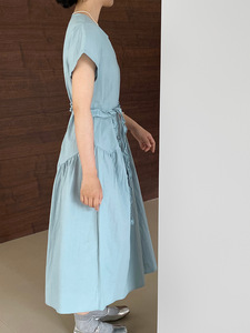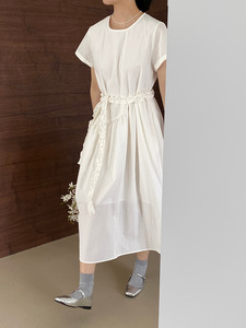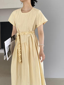 江左 韓国風ラウンドネックデザイン ウェーブベルト付き エレガントワンピース ウエストシェイプ 細見え 甘めロングワンピース レディース 0181