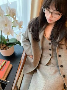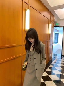 早春时髦通勤风高知羊毛混纺直身西装/马甲/开衩半裙女