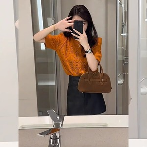 橘色镂空冰丝针织短袖正肩T恤女夏季小个子修身短款多巴胺小上衣