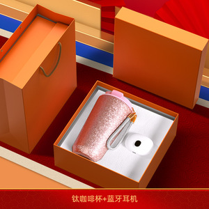 【ピンク3点セット】チタンコーヒーカップ+Bluetoothヘッドセット+ケーブル付き磁気モバイルバッテリー