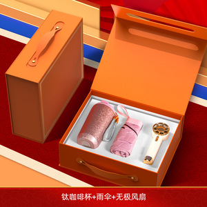 【ピンク4点セット】チタンコーヒーカップ+扇風機+傘+ケーブル付き磁気モバイルバッテリー