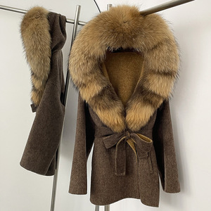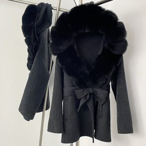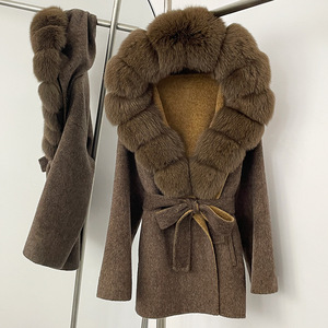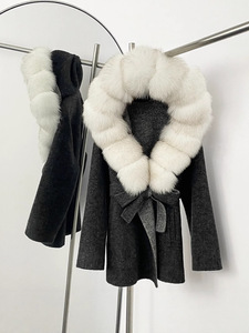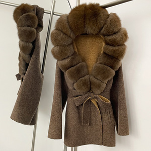 女性の秋冬の新型の高級感のウールのコートの毛皮の毛はオーバーサイズのキツネの毛の襟と帽子の両面です。