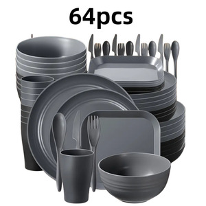 ダークグレー 8人用64点セット(プレート25枚+プレート20枚+角皿+ボウル15枚+腰カップ小+ナイフ、フォーク、スプーン)