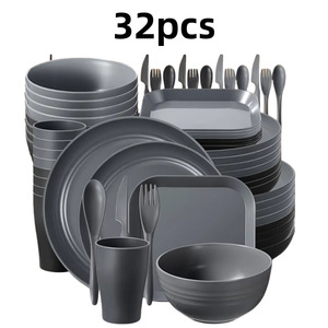 ダークグレー 4人用32点セット(プレート25枚+プレート20枚+角皿+ボウル15枚+腰カップ小+ナイフ、フォーク、スプーン)