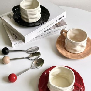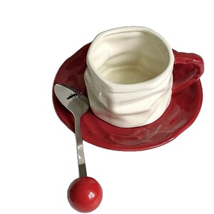 陶器製コーヒーカップ&ソーサー+ボールスプーン(レッド)