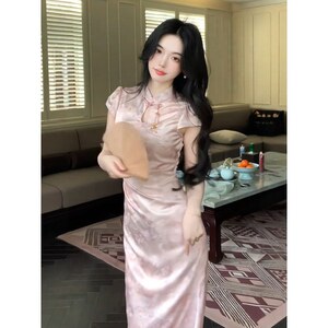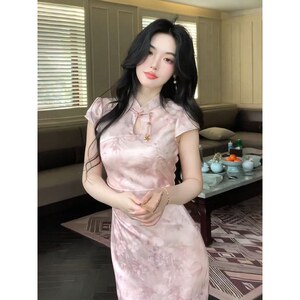 新中国風ピンクのチャイナドレスのワンピース女性は夏2025年に新型の気質が腰を収めて痩せています。