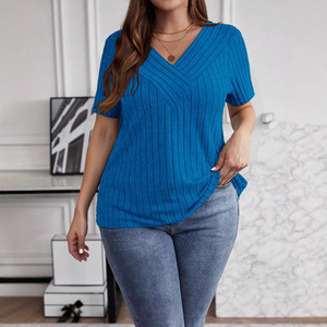 2025アマゾン春の新型越境欧米大サイズ半袖磨毛坑条純色クロスvネック上着