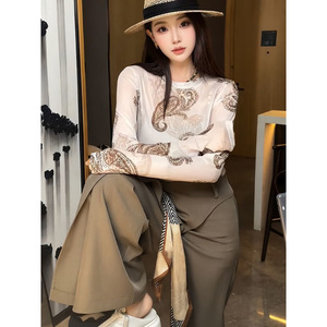 S010 気質プリントメッシュ長袖ラウンドネック Tシャツレディース夏スリムフィット外国風日焼け止めシャツ薄手トップ