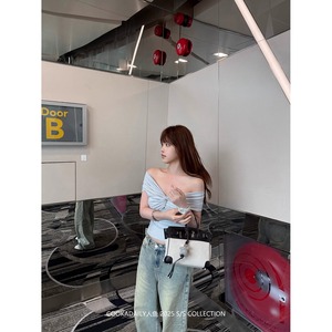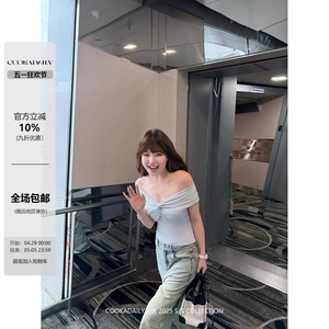 Cookadaily マーメイド セナ ブルー ミスト ワンショルダー ノット プリーツ 半袖 トップ ウエスト ショート Tシャツ レディース