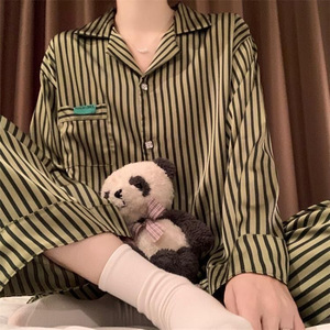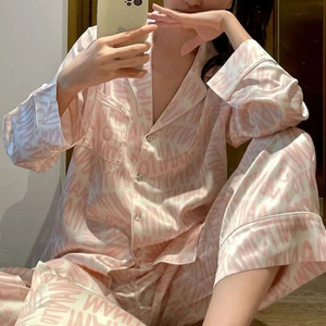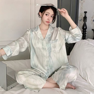 感绿色花卉印花冰丝睡衣女春秋季2025新款长袖套装丝绸家居服