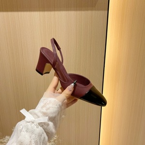 ワインレッドの小香風厚底ヒールシューズ、女性用、バックストラップ付き、スクエアトゥ、配色、ミドルヒール、バックオープン、トゥカバー、サンダル、多用途