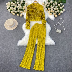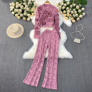 御姐女神范蕾丝拼接立体花朵修身显瘦长袖上衣+高腰阔腿裤两件套
