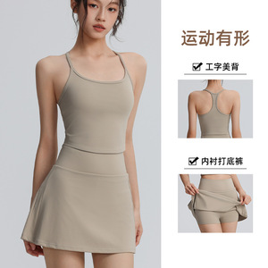 【セット】I字型スポーツベスト露出防止テニススカートフィットネスウェアポケット付きスポーツセット女性用