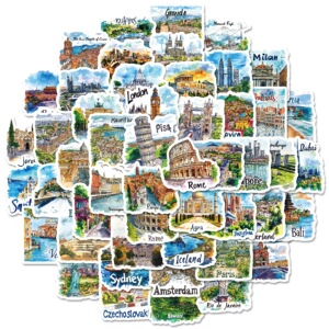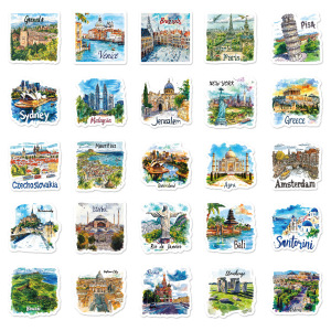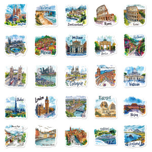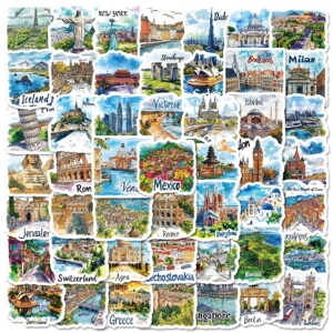 新しい 50 枚の手描きの観光地図、ランドマーク、建物、落書きステッカー、装飾ギターノートブック DIY 防水ステッカー