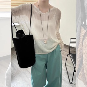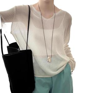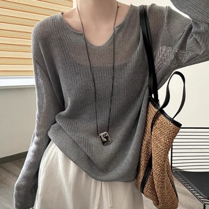 韓国系グレーvネック日焼け止め長袖ニットtシャツ女性夏透かし彫りブラウスデザイン感氷糸薄い上着