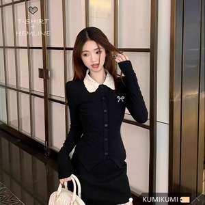 法式气质套装长袖翻领黑色T恤女装春季高腰半身裙两件套