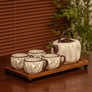 JTH ブラウン プリーツ ティーセット C (ポット 1 個、カップ 4 個、木製トレイ 1 個)