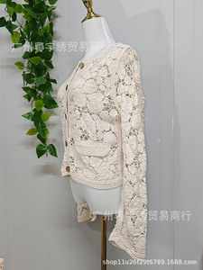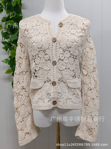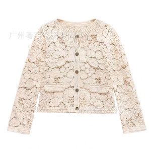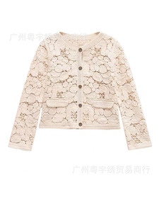 優しいスタイルの必需品・オフホワイトの中空かぎ針編みショートカーディガン、長袖、ショートバージョン、遊び心と目を引くレトロエレガンス