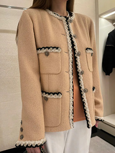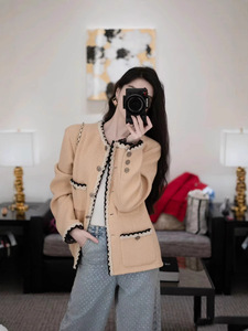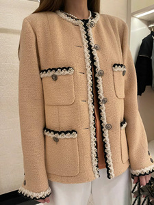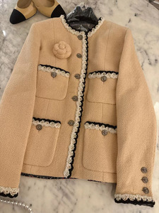 正しいバージョン~25A秋冬黒裏地ラウンドネックロングアプリコット長袖暖かいウールジャケット女性用9892