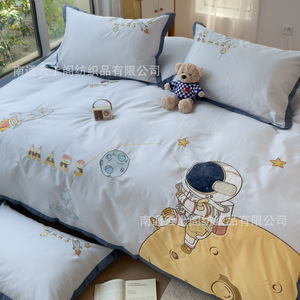 100番手長綿4点セット 漫画少年宇宙飛行士 純綿掛け布団カバー 綿刺繍 子供部屋3点セット