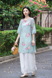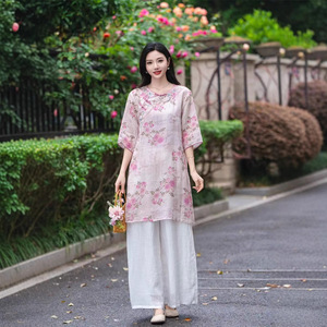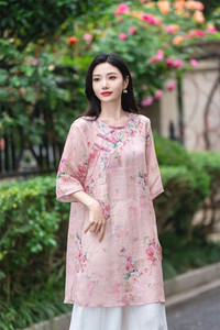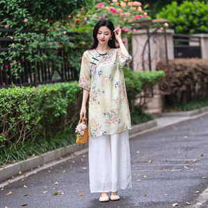 2025 新しい夏のラウンドネックプルオーバー斜め襟ボタンルーズスリム Tシャツデジタルプリントラミーミッドレングストップ