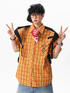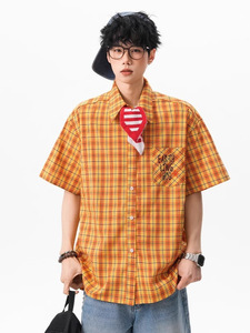 アメリカンコントラストカラー刺繍半袖シャツ男性と女性のための夏ルーズドーパミンインシャツカジュアルカップルジャケットトレンディ