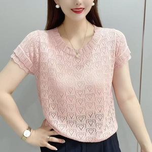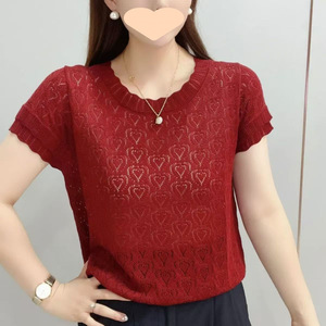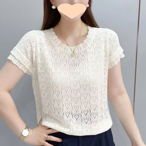 休闲时尚圆领镂空花边短袖针织衫宽松显瘦气质百搭减龄薄款上衣女