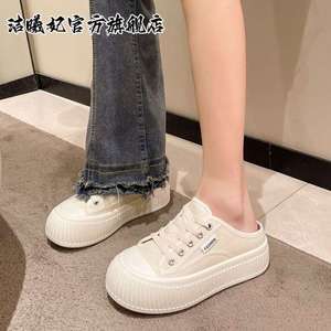 潔セイ妃の厚い底の包頭の半分はビスケットの靴の女性の2025夏の新型のキャンバスの靴の怠け者の足を引っ張って白い靴を漕ぎます。