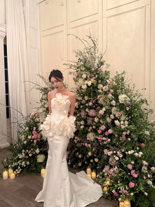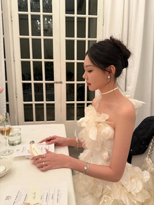 白い婚約ドレス、ハイエンドの軽い高級感、ニッチな社交界の気質、チューブトップドレス、立体的な花のモーニングローブ、乾杯ドレス