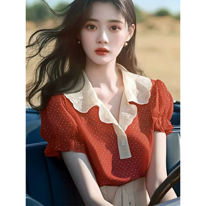 レッド水玉半袖シャツ女性のための 2025 新しい夏のルーズシフォンシャツユニークで超見栄えの良いパフスリーブトップ