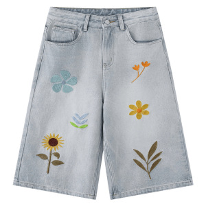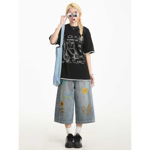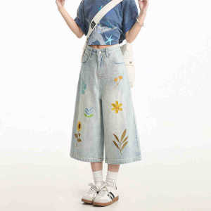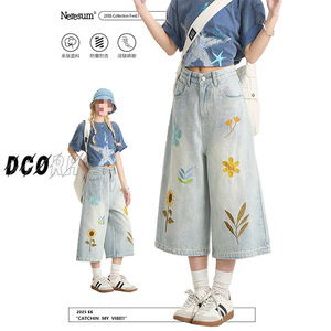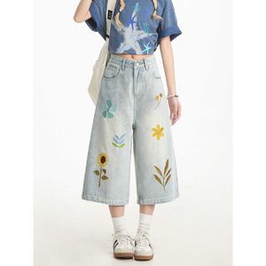 ジーンズ女性の夏アメリカン植物花刺繍デザインニッチ個性カジュアル七分ワイドレッグパンツ