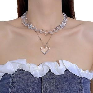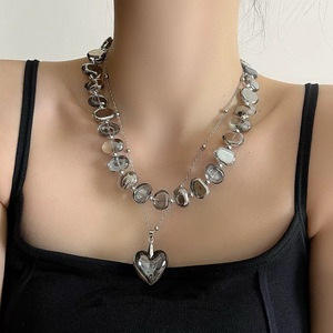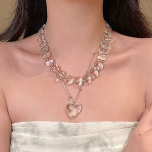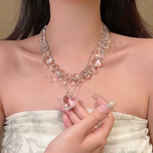 中世の不規則な透明なグレークリスタル二層ビーズネックレス女性のニッチハイエンドスタッキングラブペンダントネックレス
