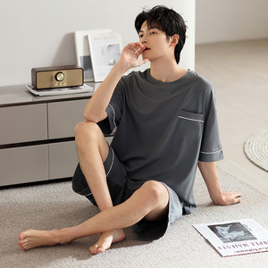 クールパジャマメンズ夏薄いアイスシルク夏ラウンドネックシンプルな無地半袖ショーツメンズホームウェアセット
