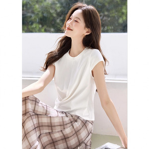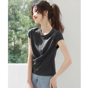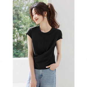 カジュアルデザイン不規則ツイスト半袖2025夏新作右肩スリムフィットTシャツ