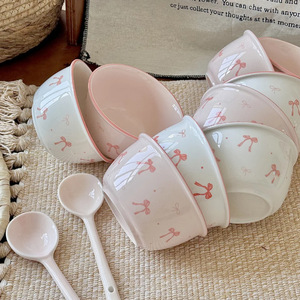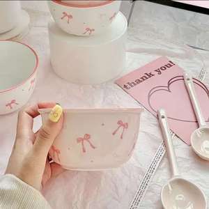 ガーリーハートボウルとスプーンピンクのリボンセラミックボウル釉下色家庭用ピンクライスボウルデザートボウル電子レンジ対応
