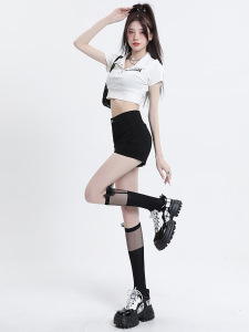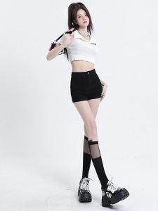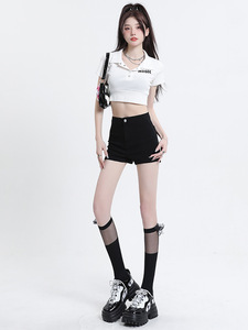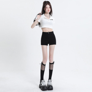 黒いデニムのショートパンツの女性2025年夏の新型ハイウエストのアメリカ式ギャルのお尻のタイトな爆発のa字のホットパンツ